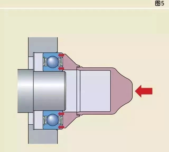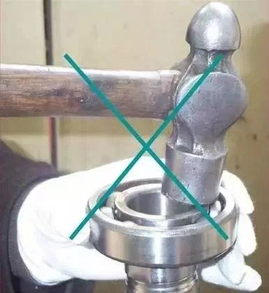 安裝內(nèi)圈(或外圈)過盈配合的軸承,禁止用鐵錘直接敲擊軸承內(nèi)圈(或外圈)端面,這樣很容易把擋邊敲壞。應(yīng)該采用套筒放在內(nèi)圈(或外圈)端面上,用鐵錘敲擊套筒來安裝。
